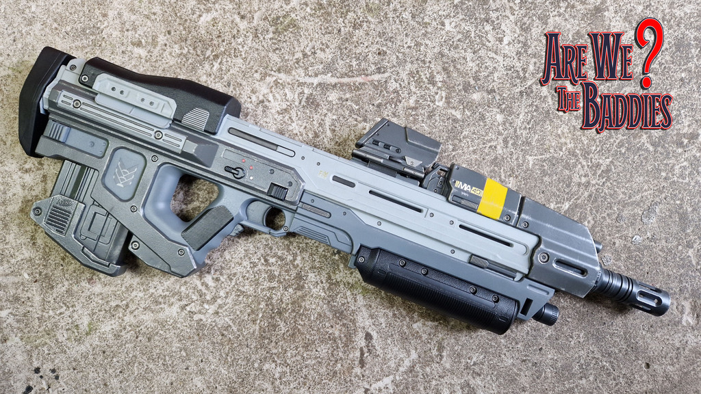 A full repaint of a Nerf rifle into an MA40 from the Halo videogame. Multiple grey tones with edges chipped and a worn look to give a used battle rifle condition.