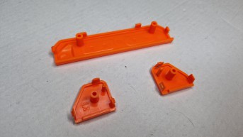 Bright white and green body, with really bright orange magazine, barrel, torch, magazine release and fake ejection ports. The black handgrip, shoulder pad and top ejection port are all black. They are the only 3 things I won't be painting.